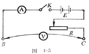 (1)演示导体的电阻与材料有关。把安培计、开关、电源和滑动变阻器R串联成图45所示的电路。分别把图44中的导线abab′连接到图45中的BC间,并将伏特计并接在abab′上,调节滑动变阻器,使BC间电压保持3伏,分别由安培计读出电路中的电流值。由测出的电流得出:长度和横截面积相同的康铜线和镍铬线,康铜线的电阻较小,镍铬线的电阻较大。说明导体的电阻与材料有关。